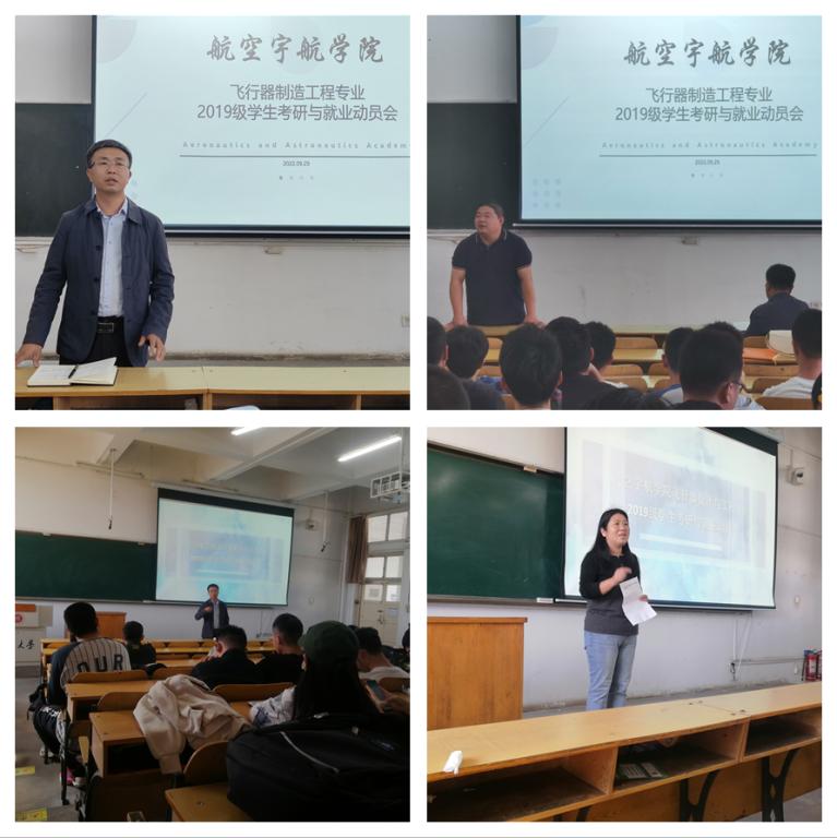 继面向工程力学专业2019级学生进行了考研与就业的动员之后,于9月29日下午、9月30日下午相继对飞行器制造工程专业、飞行器设计与工程专业2019级学生分别进行了考研与就业动员。院党委副书记史瑞根,专业教师赵熹教授、原梅妮教授,就业辅导员王姣老师出席动员会,对考研、就业进行了指导动员。